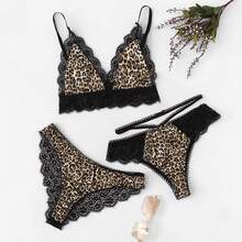 - Scalloped Trim Leopard Satin Lingerie Set With Panty 3pack